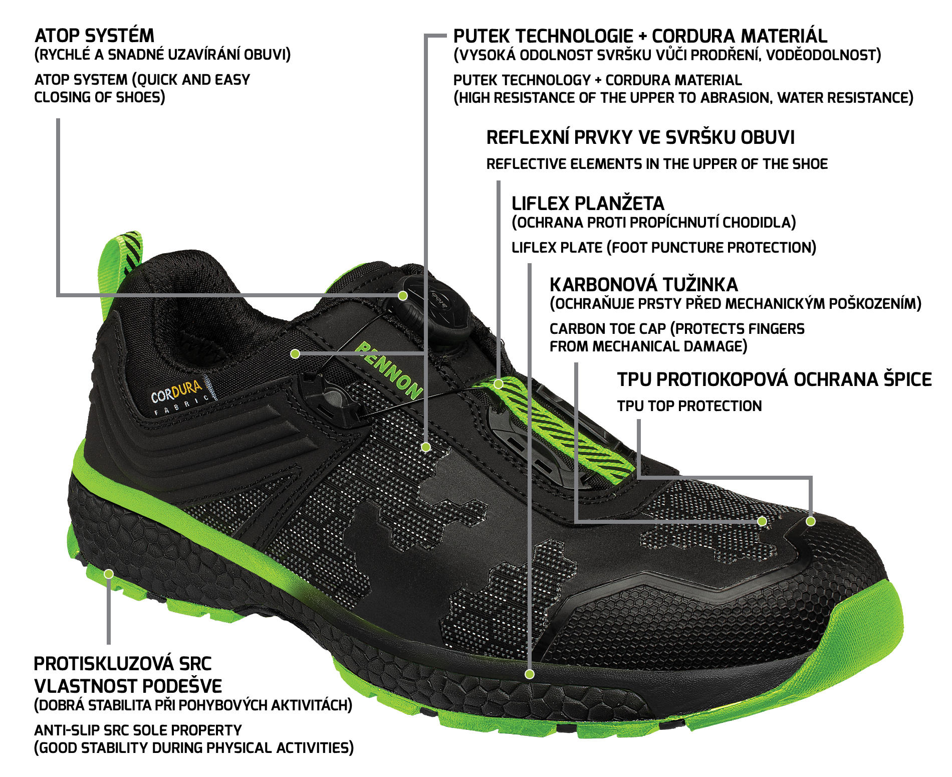 Tato obuv představuje revoluci v pracovní obuvi, neboť v sobě skloubila spoustu užitečných vlastností v jednom. Vyznačuje se vysokou odolností vůči mechanickému poškození, vůči vodě, kontaktnímu teplu, uzavírání obuvi je snadné a rychlé, obuv má spoustu bezpečnostních prvků, anatomicky tvarovaná stélka má zdravotní přínosy na stav chodidla, obuv celkově je mimořádně prodyšná.
