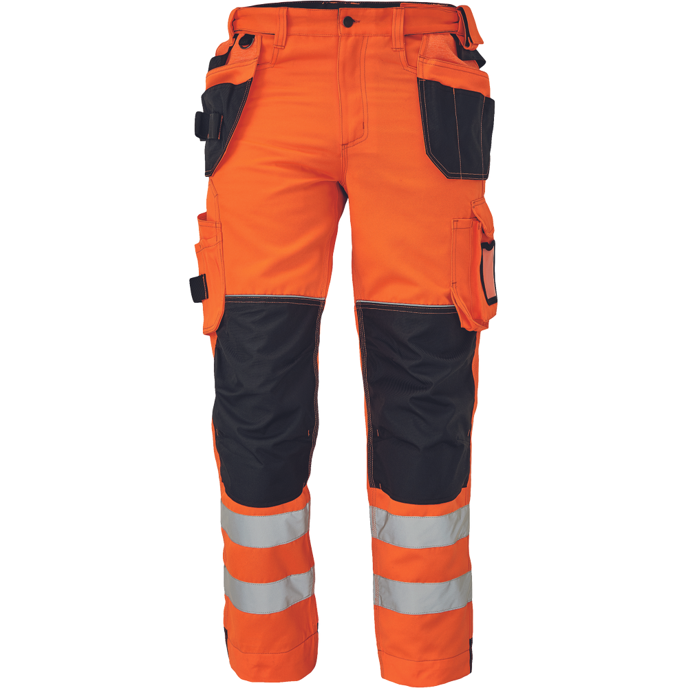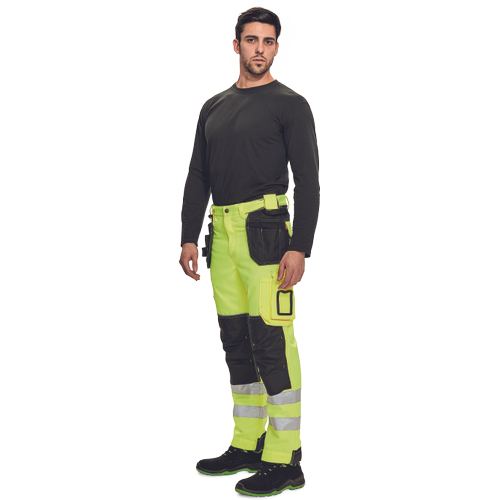 Kvalitní pánské pracovní klahoty v HI-VIS provedení s elastickým pasem; 6 fukčních kapes; 2 extra vložitelné kapsy; 1 transparentní pro ID kartu; 600D Oxford zesílená oblast kolen s možností vkládání kolenních výztuh; záložka na nohavici umožňující prodloužení délky až o 5 cm; dekorativní prošití.