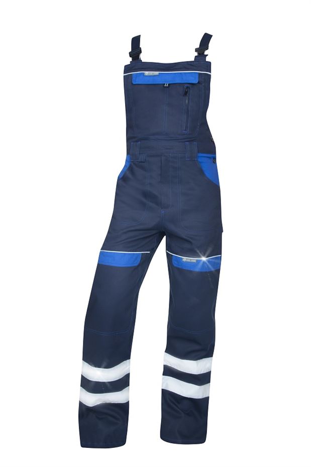Kalhoty jsou doplněné dvěma kapsami na zadním díle. Boční kapsy slouží pro pohotové uložení nářadí přímo na nohavicích. Na laclu můžete využít další multifunkční kapsu. Pro bezpečný pohyb po provozu nebo stavbě slouží reflexní pruhy a doplňky.