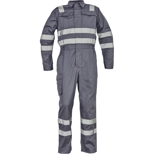 Pánský lehký pracovní overal s reflexním pruhy přes ramena, v bocích, na rukávech a nohavicích; elastický pas, zapínání na zip kryté légou na suchý zip; 2 postranní kapsy, 1 kapsička na mince.