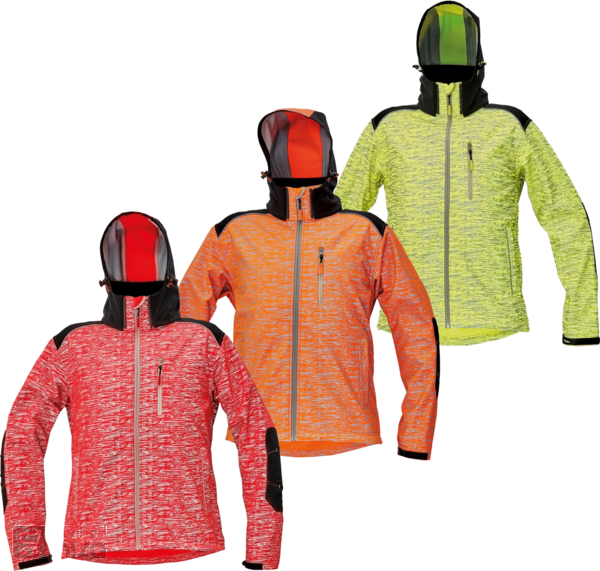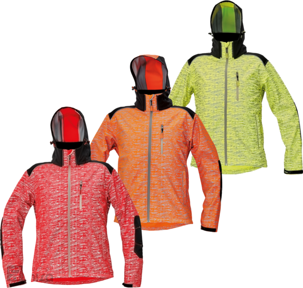 Pánská softshellová bunda s reflektivním dekorativním potiskem na fluorescentním podkladu. Odnímatelná kapuce s efektním uchycením. Oblečení je vhodné pro práci ve většině běžných provozů.
