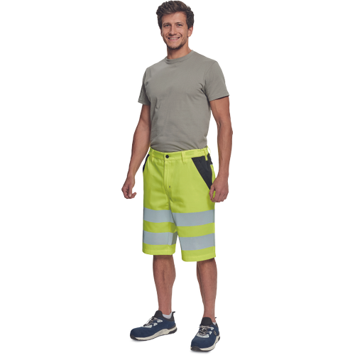 Pánské HI-VIS pracovní šortky s elastickým pasem; 2 přední kapsy, 2 zadní kapsy; dvojice tištěných 7 cm reflexních pruhů po obvodu stehen; reflexní paspulky.