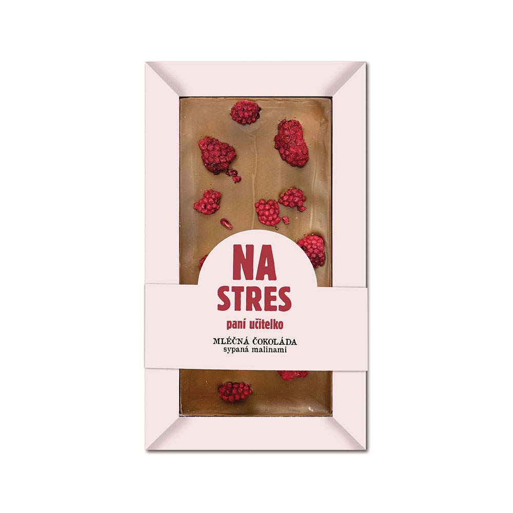 Dárková ručně vyráběná sypaná mléčná čokoláda 80 g s malinami pro paní učitelku na překonání stresu. Extra jemná výběrová čokoláda s výraznou chutí a vysokým podílem kakaového másla.