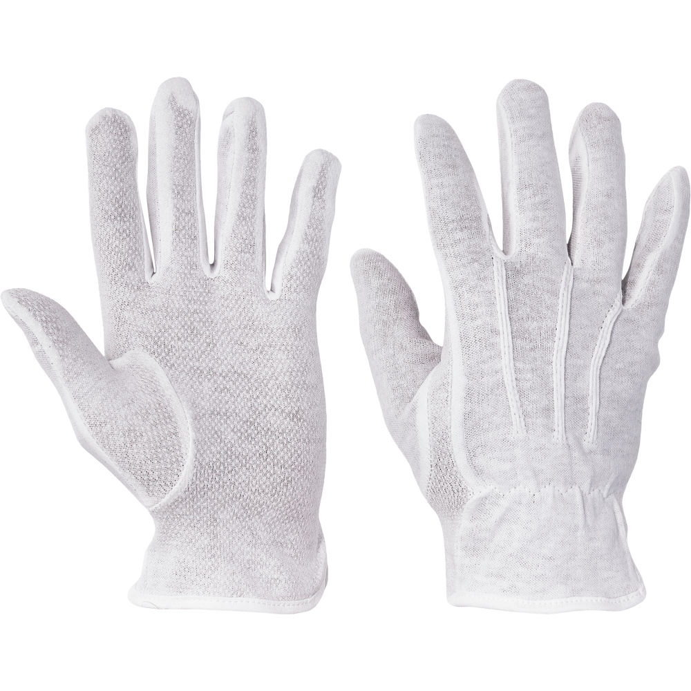 Rukavice šité z bavlněného úpletu, s PVC terčíky v dlani a na prstech, pružinkou na horní části zápěstí, bez manžety. č. 6" - 12"
