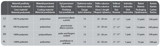 • Nylonový bezešvý úplet, dlaň a prsty máčené v Polyuretanu. Neobsahují silikon