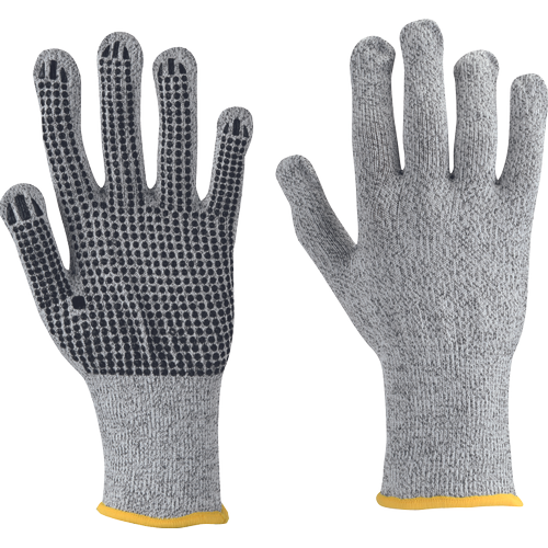 Pletené, bezešvé rukavice z modifikovaného skleněného vlákna, Spandexu a nylonu, s PVC terčíky v dlani a na prstech a odolností proti prořezu tř. 5, č. 8" a 10" ZDE naleznete tabulku velikostí.Specifikace pro rukavice CROPPER DOTS
