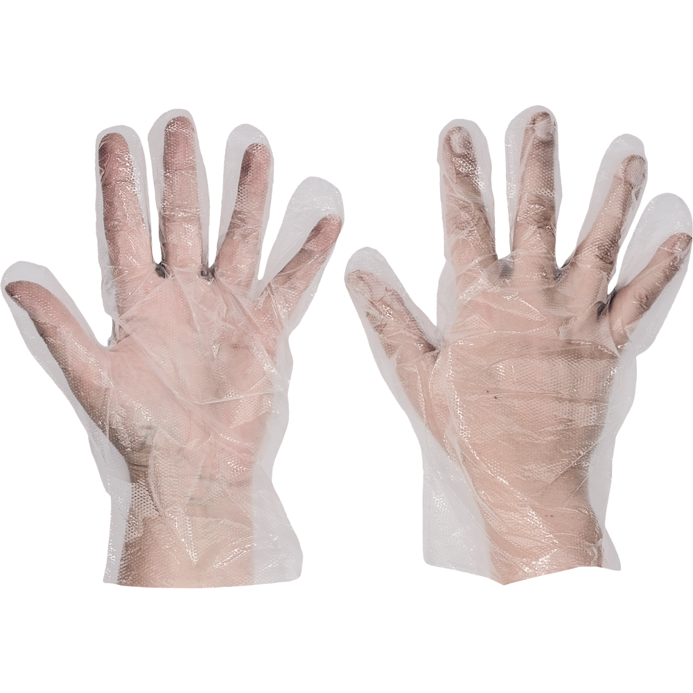 Jednorázové rukavice z tenké polyetylénové folie, vhodné pro krátkodobý styk s potravinami, balení po 100 ks, v kartonu je 100 balení, velikosti 9 (dámské), 10 (pánské).