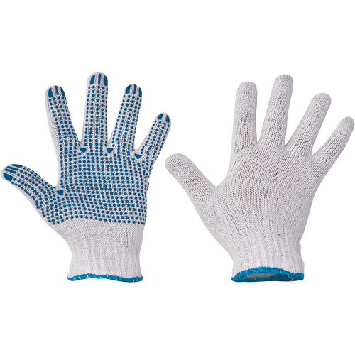 Pletené, bezešvé rukavice, ze směsi polyester/bavlna s PVC terčíky v dlani a na prstech, č. 9" a 10". ZDE naleznete tabulku velikostí.Specifikace pro rukavice povrstvené PLOVER