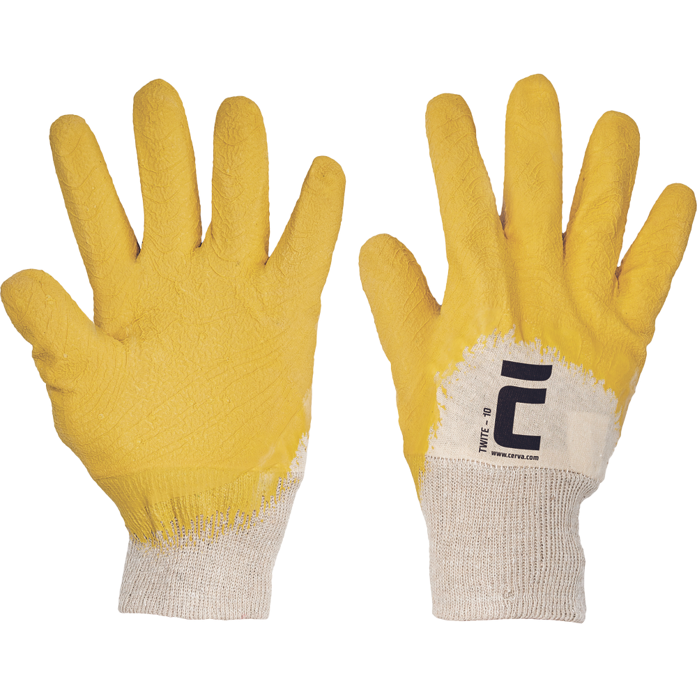 Rukavice šité z bavlny, polomáčené v přírodním latexu, s protiskluzovou úpravou v dlani a na prstech, č. 10". ZDE naleznete tabulku velikostí.Specifikace pro rukavice povrstvené TWITE
