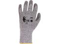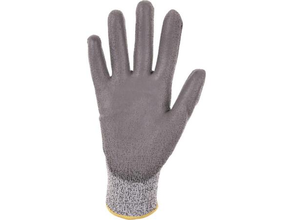 Protipořezové, bezešvý úplet z vláken HPPE, šedého nylonu a elastanu, dlaň a prsty máčené v polyuretanu.