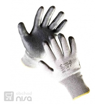Pletené, bezešvé rukavice z modifikovaného skleněného vlákna, Spandexu a nylonu, s nánosem HCT nitrilu v dlani a na prstech a odolností proti prořezu tř. 5, č. 7" - 10".