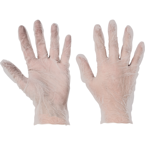 Jednorázové rukavice z tenkého vinylu, pudrované krabice po 100 ks, vhodné pro krátkodobý styk s netukovými potravinami, velikosti S-01, M-02, L-03, XL-04.