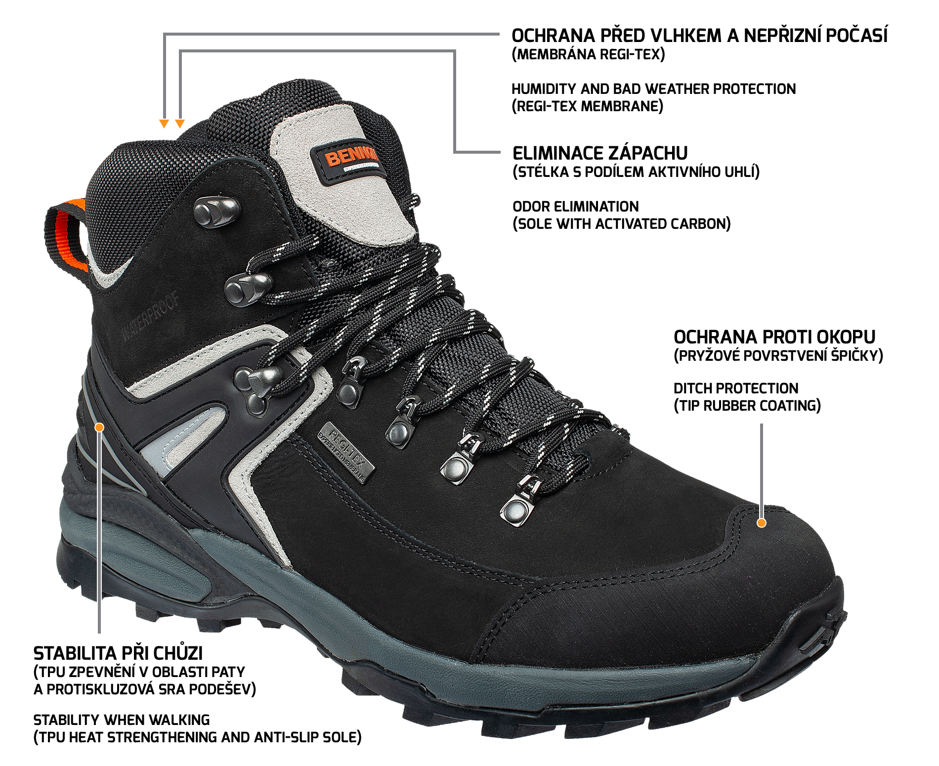 Obuv je vybavená voděodolnou membránou REGI-TEX®, která chrání chodidla před vlhkem a nepřízní počasí.