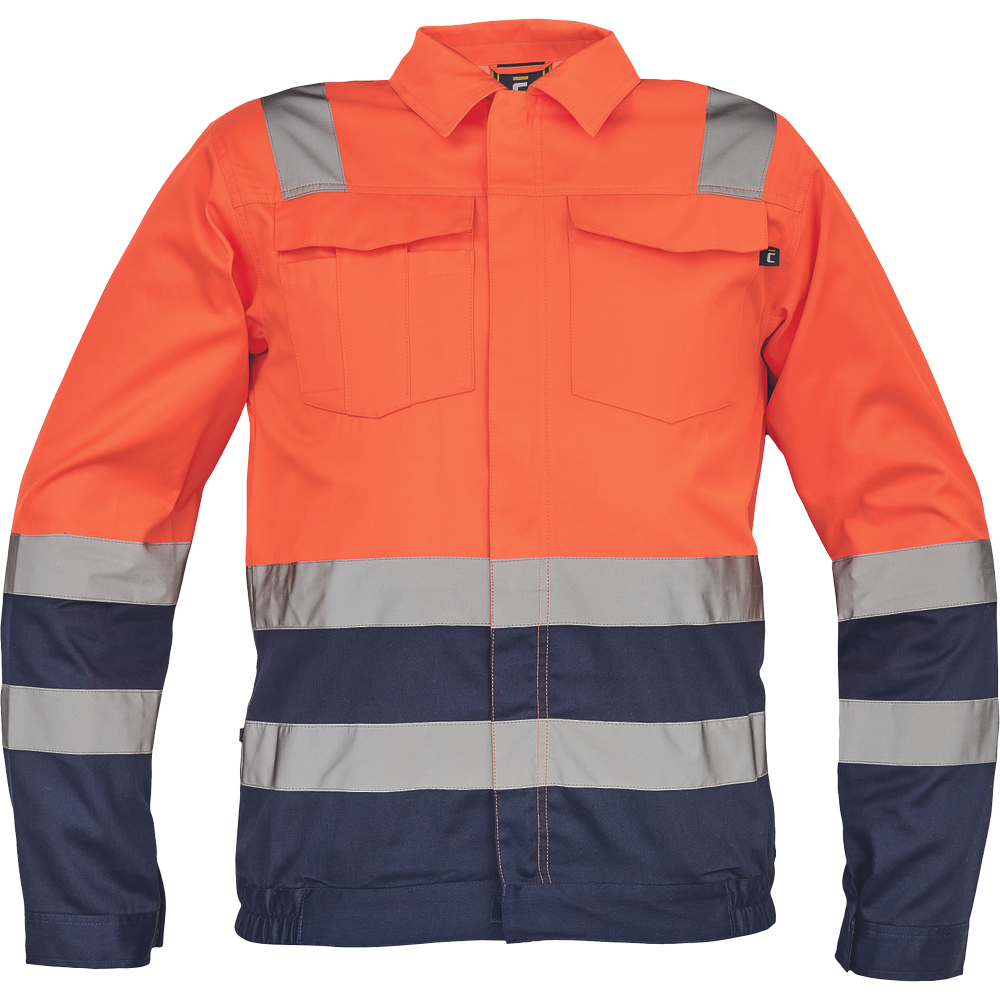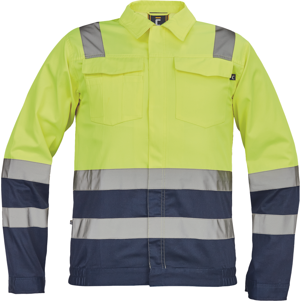 Pánská lehká HI-VIS pracovní bunda s reflexními pruhy přes ramena, v bocích a na rukávech; zapínání na zip kryté légou na suchý zip.Najděte svoji velikost
