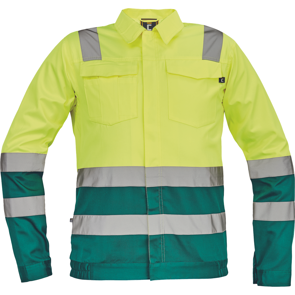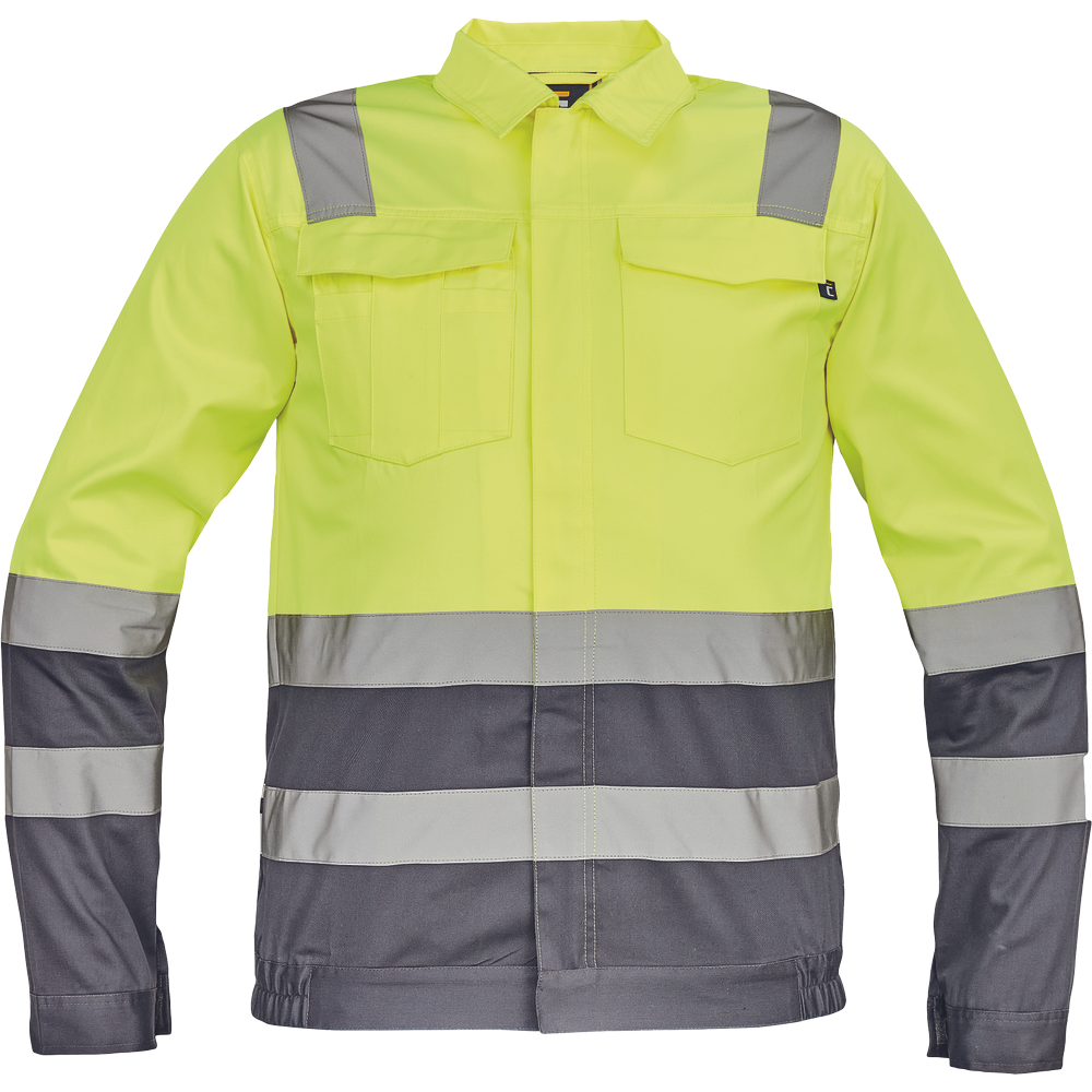 Pánská lehká HI-VIS pracovní bunda s reflexními pruhy přes ramena, v bocích a na rukávech; zapínání na zip kryté légou na suchý zip.