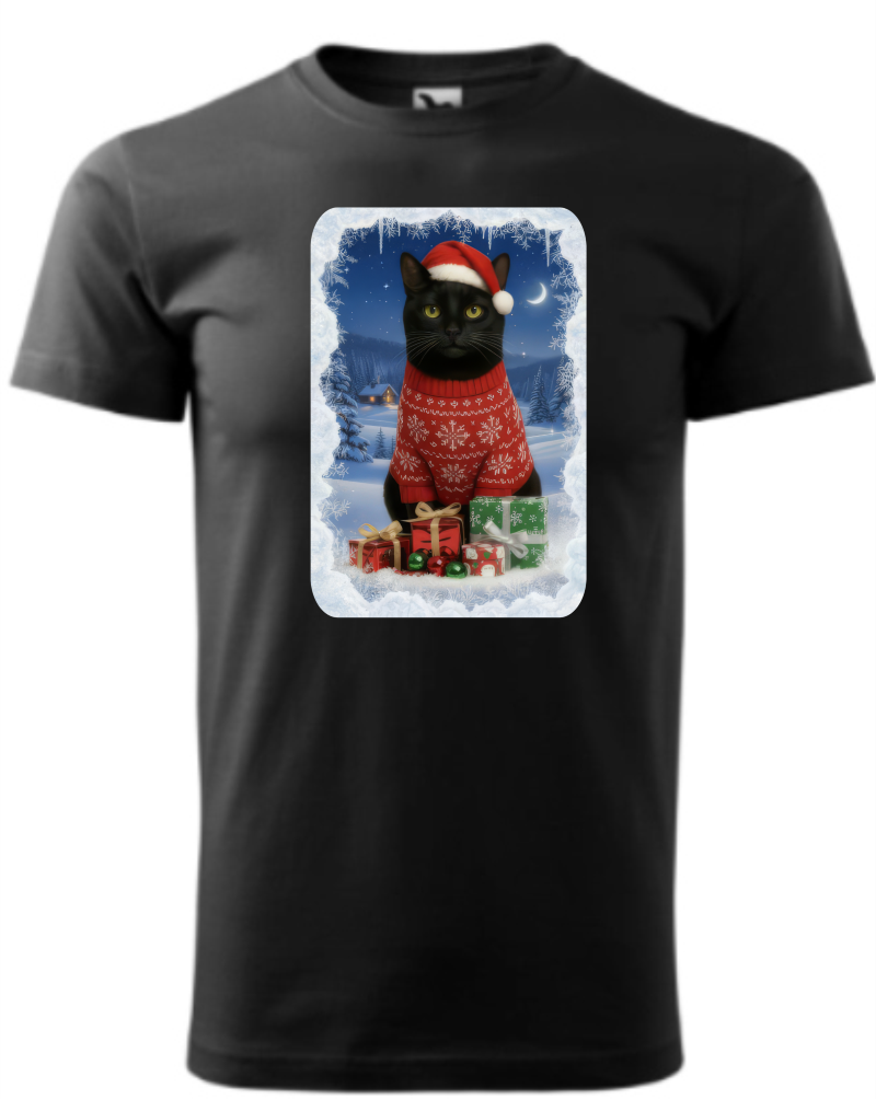 Originální tričko s vánočním motivem černého kocurka, potěší každého milovníka koček! Roztomilý design zachycující kocourka s vánoční čepičkou přináší tu pravou sváteční atmosféru.