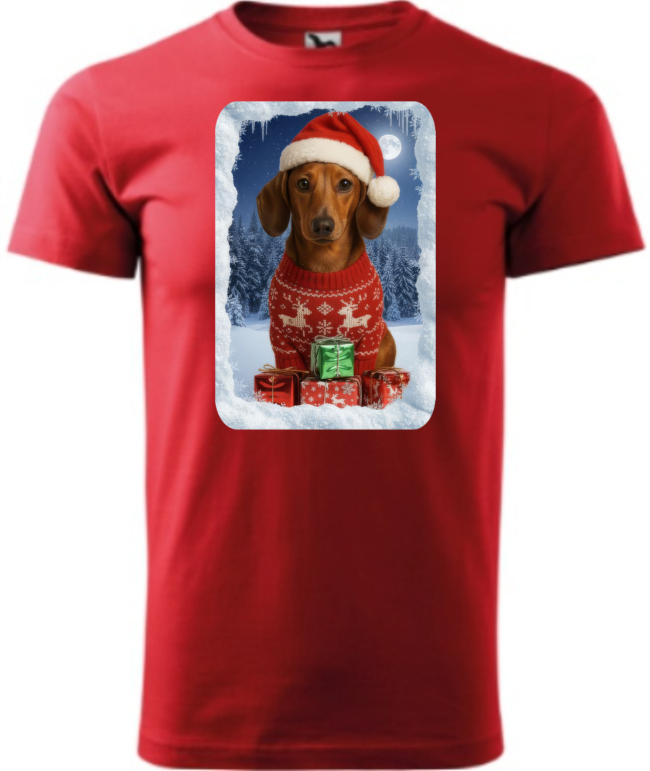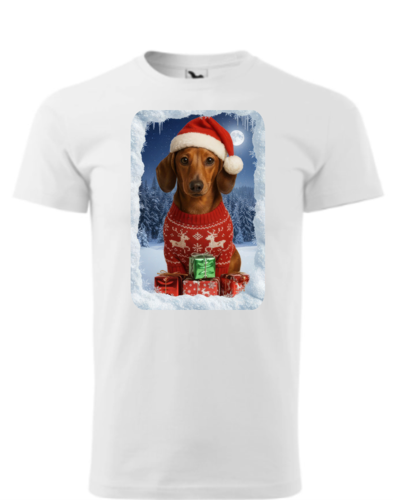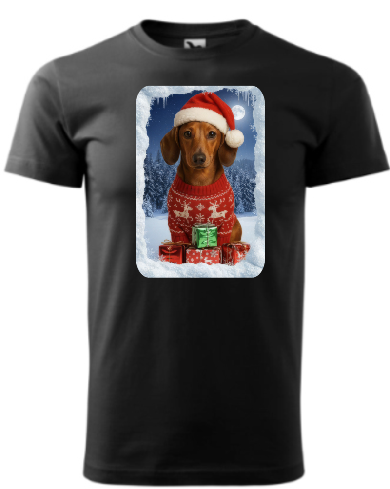 Představujeme vám kouzelné vánoční tričko, které si zamiluje každý milovník jezevčíků! Na přední straně trička najdete roztomilého jezevčíka ozdobeného vánoční čepičkou, který vykouzlí úsměv na tváři všem kolem vás.
