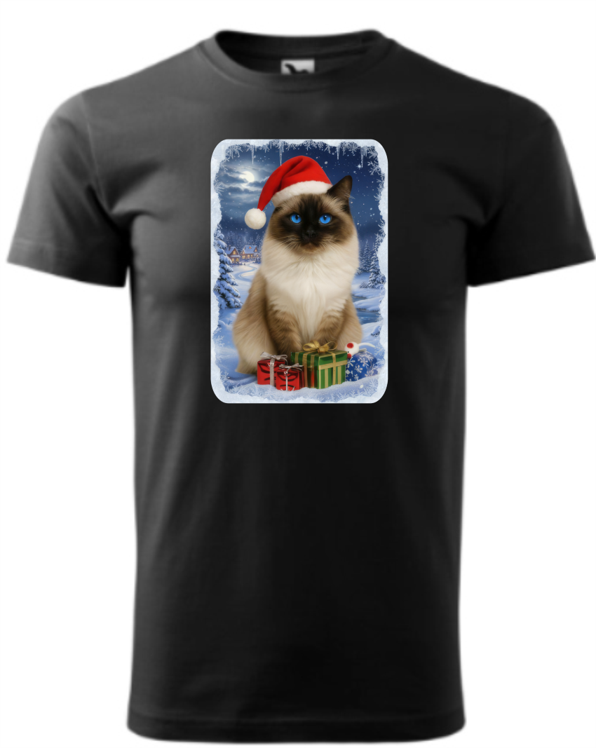 OOriginální tričko s vánočním motivem kočky Ragdoll potěší každého milovníka koček! Roztomilý design zachycující kočičku s vánoční čepičkou přináší tu pravou sváteční atmosféru.
