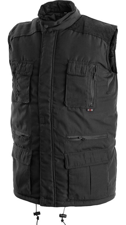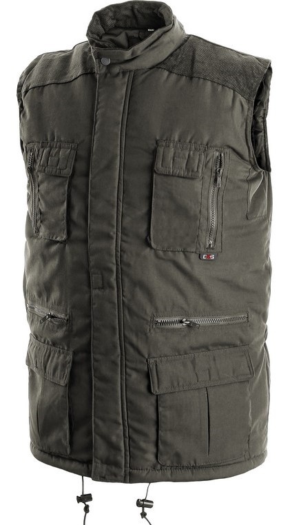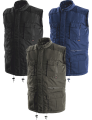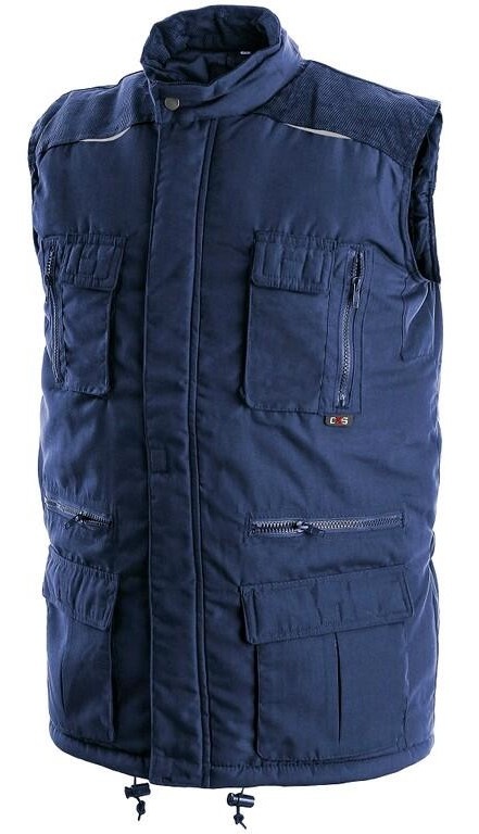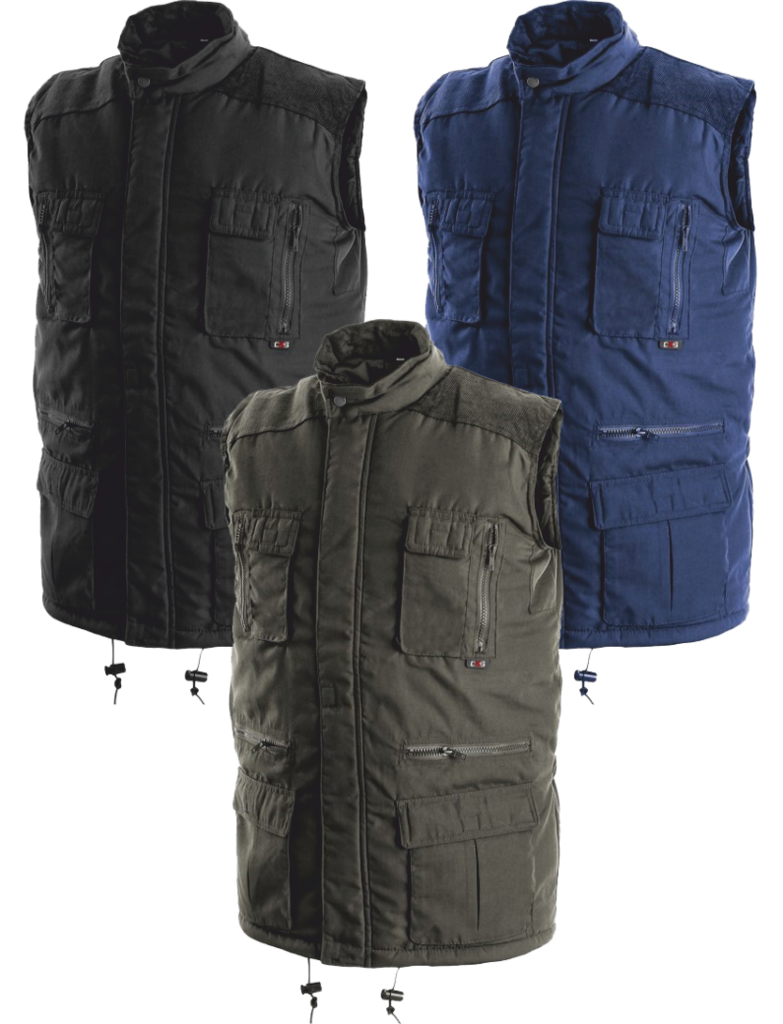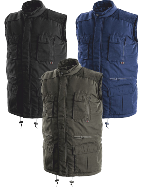 Zateplená pracovní vesta, ramena a límec prošitý manšestrem, pružné stažení průramku, možnost stažení vesty v pase