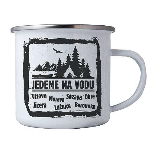 Plecháček s potiskem pro vodáky – Jedeme na vodu. Průměr plechového hrnku 8 cm. Originální smaltový hrnek pro vodáka či vodačku.