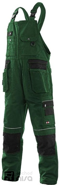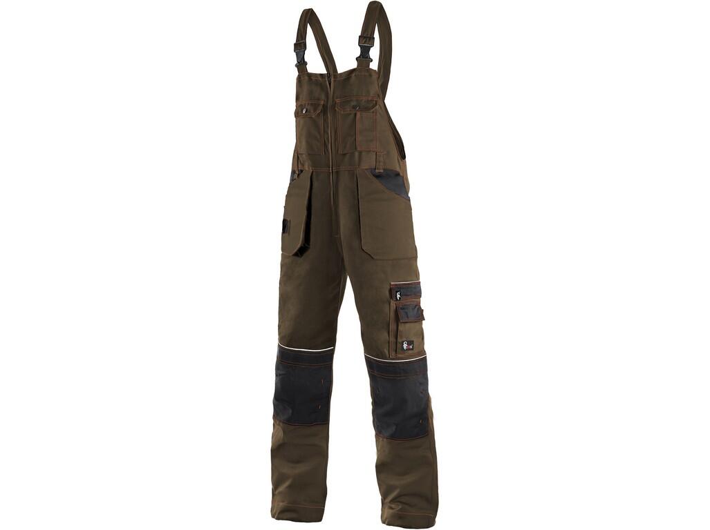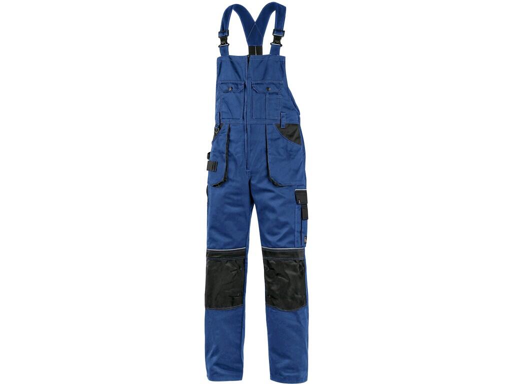 Pánské pracovní kalhoty s laclem, zdvojená kolena pro nákoleníky, našité kapsy, klínové přední kapsy a zasunovací odnímatelné kapsy na zip s poutky na nářadí, náprsenka s kapsami a rozepínáním uprostřed, reflexní doplňky.