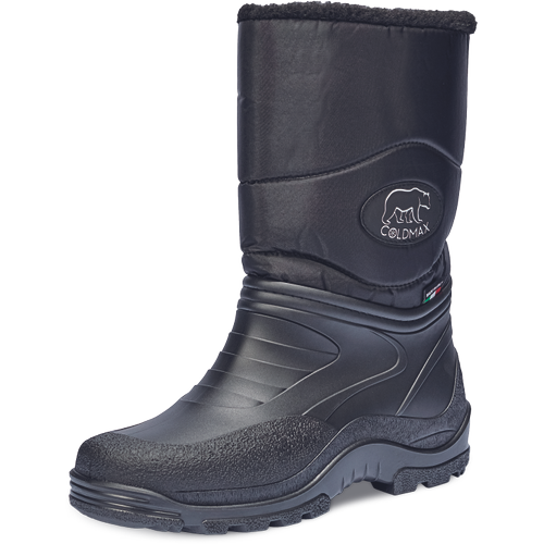 Vysoká zateplená obuv s podešví z PVC. Svršek vyroben v kombinaci PVC a textilie.