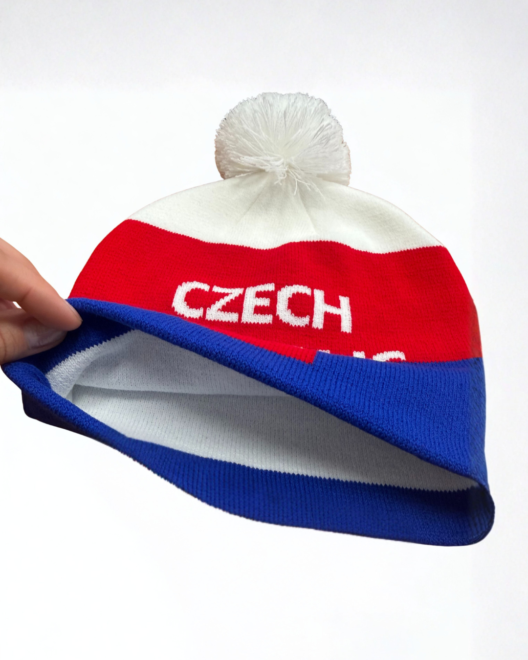 Sportovní zimní čepice s výšivkou v národních barvách s bambulí, ideální pro fanoušky českého sportu a zimní aktivity.