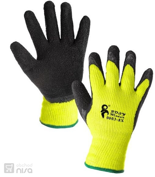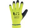 Zimní rukavice, fluorescenční česaný akrylový úplet, dlaň a prsty povrstvené latexem, protiskluzný povrch.